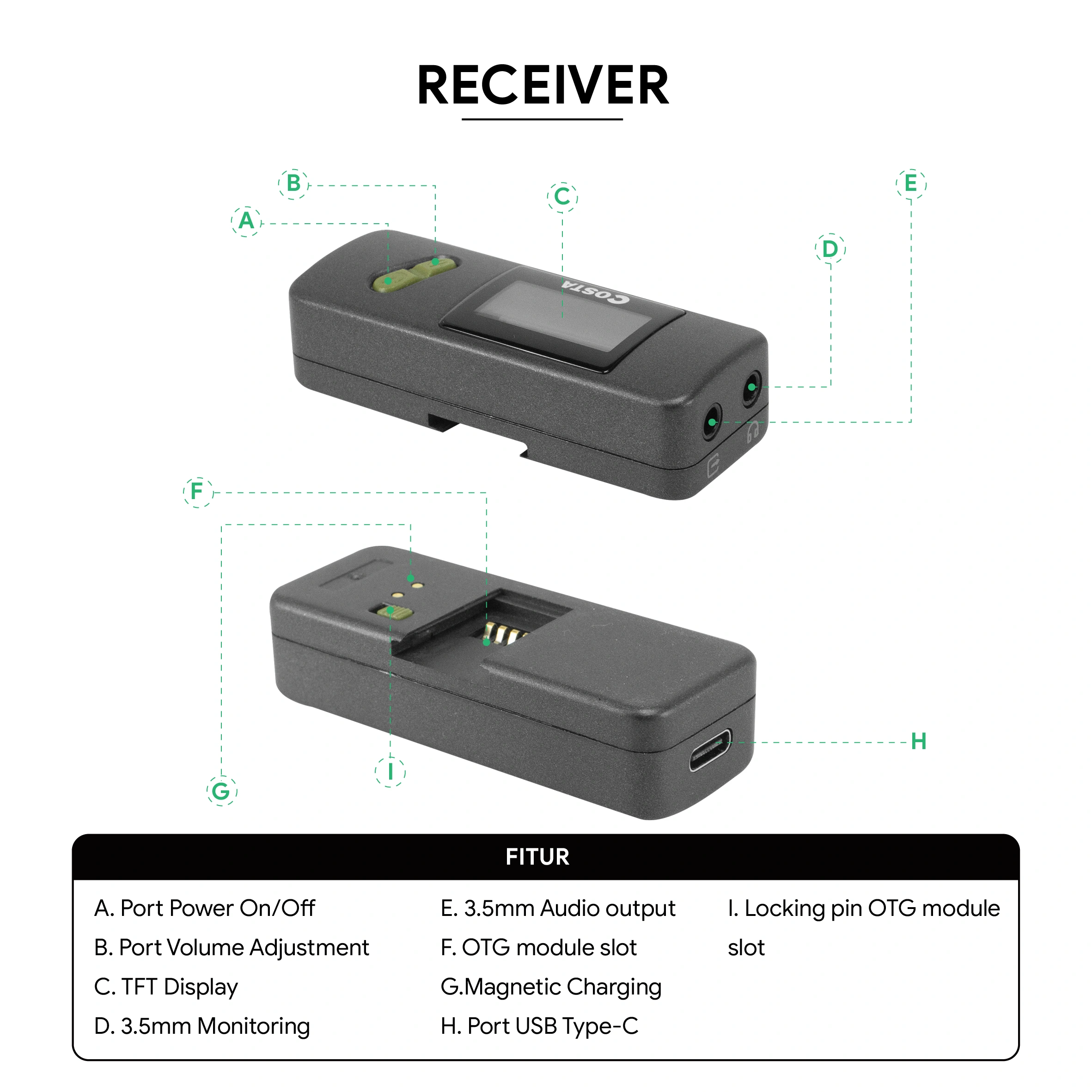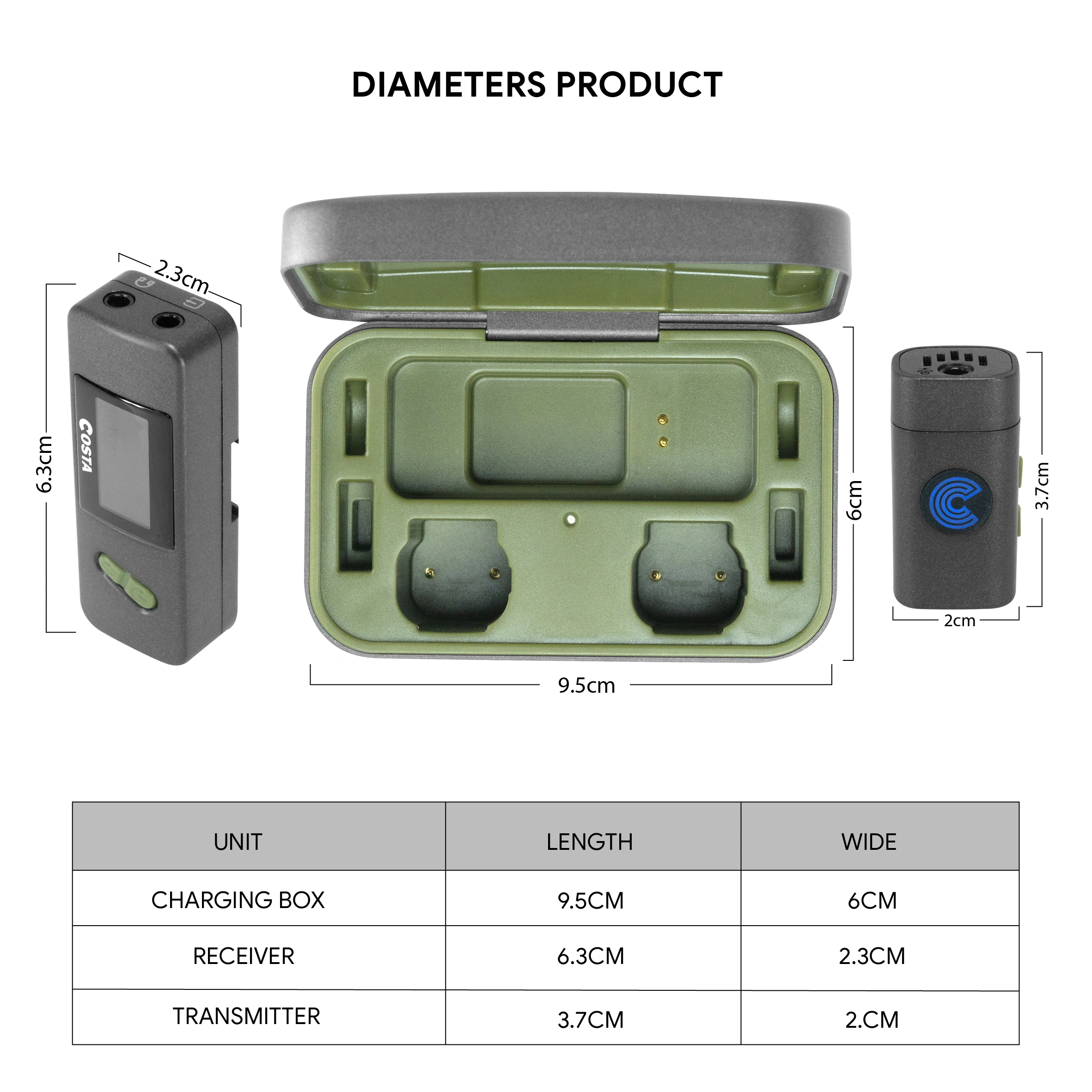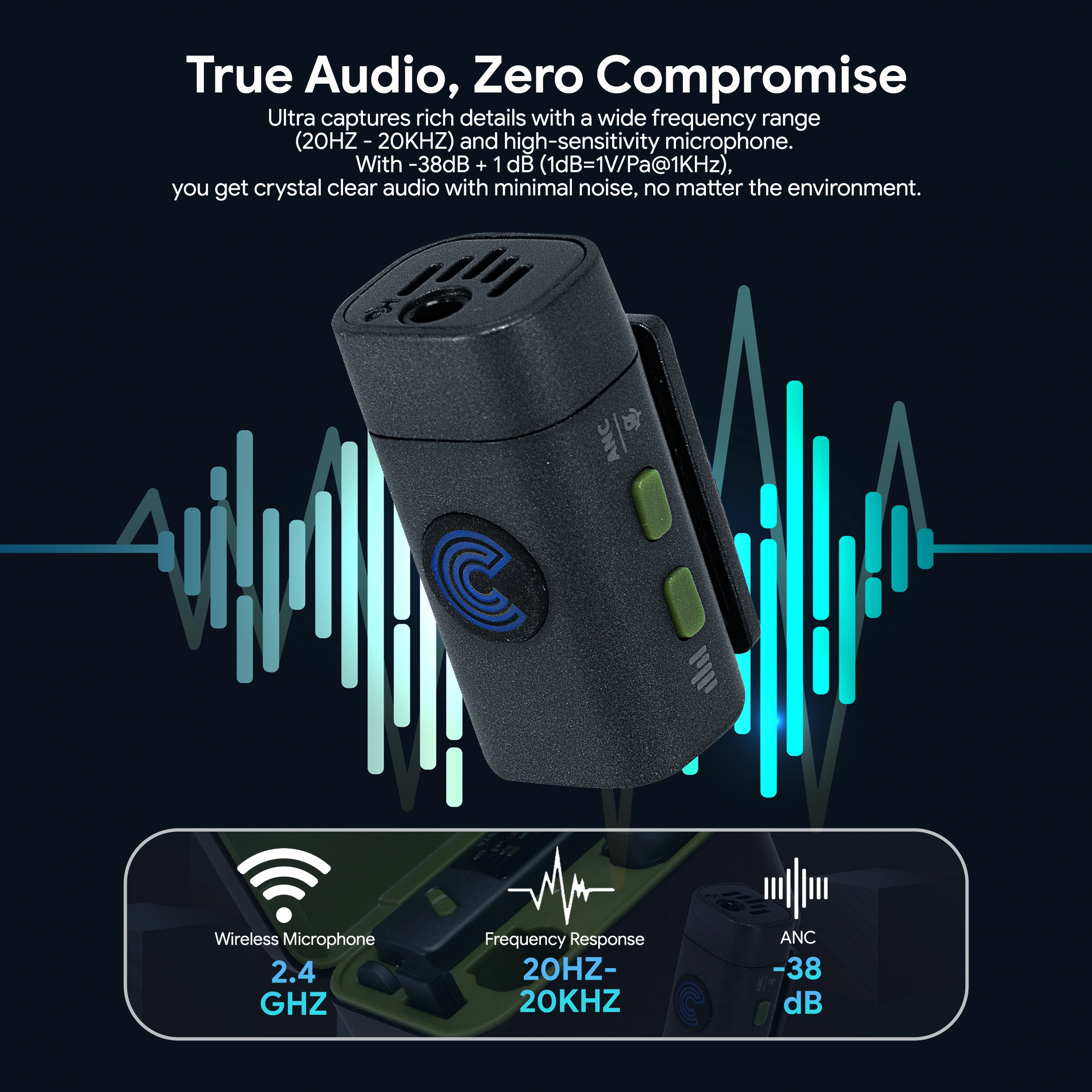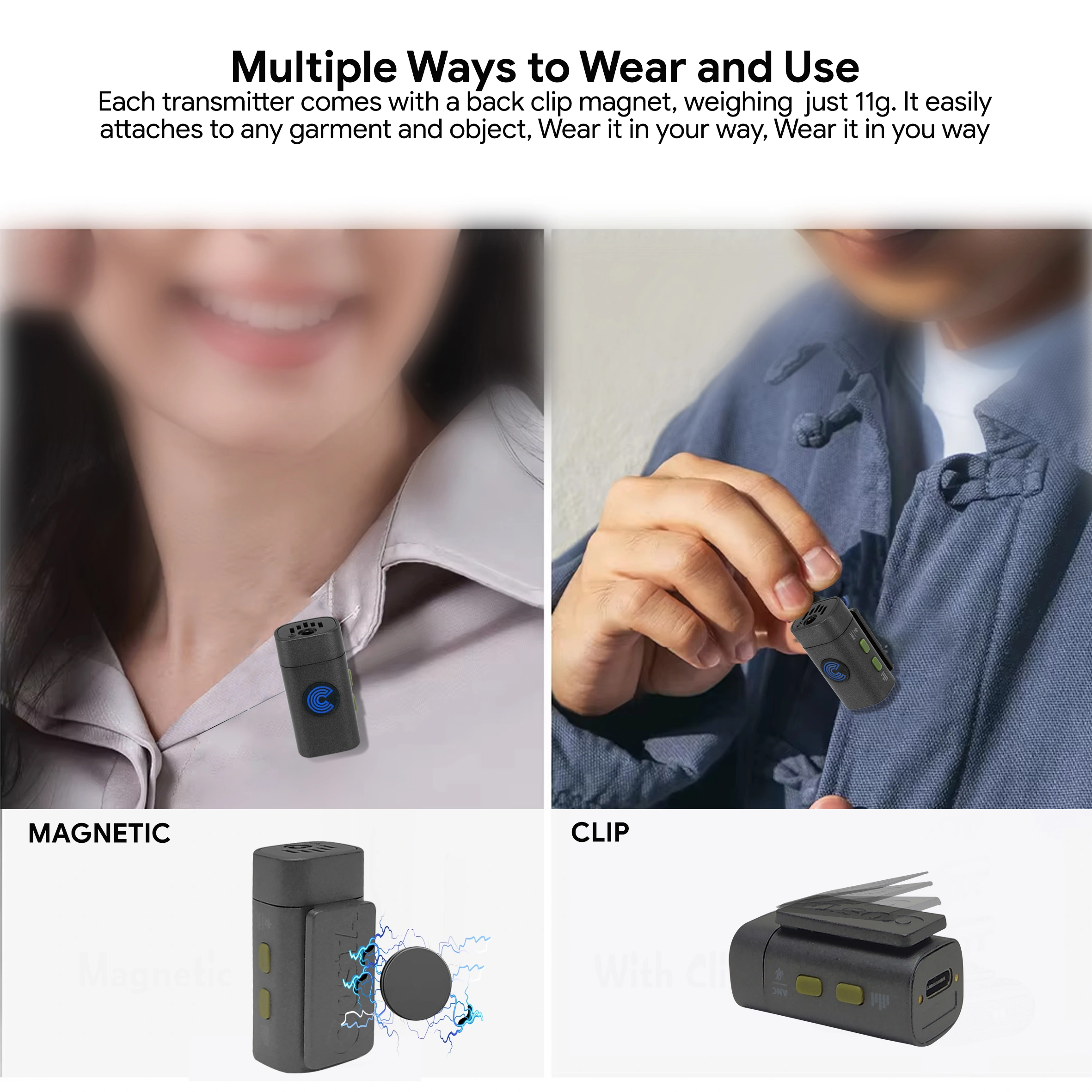 2-Person Interviews, Videos, Streaming Connects to Cameras, iOS/Android Devices, mixer, Laptop 2 x Clip-On Transmitter with Mic Compact Dual-Channel Receiver Noise ANC Stereo Mono Switch 5-Level Gain Adjustment (RX) 3-Level Volume Adjustment (TX) Support 3.5 External Clip On Mic Real Time Monitoring Intuitif Display Amoled 50m Range Charging Case, Built-In Batteries