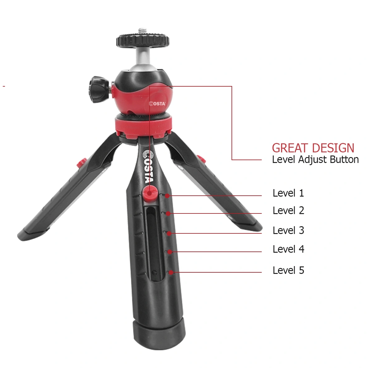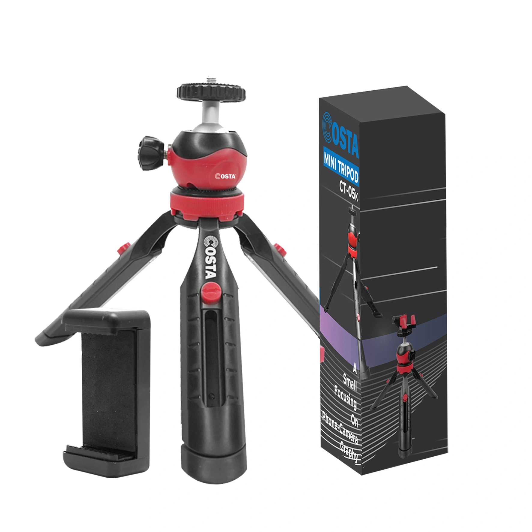 COSTA CT-05K This mini tripod has an integrated smartphone holder designed to safely accommodate various sizes of mobile devices. This holder is equipped with a safety mechanism that ensures your device remains stable and safe from falling while taking pictures or recording videos.